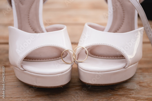© elgreko, Obraz premium Engagement rings on a wooden background in front of the shoes