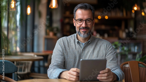 Fototapeta premium Engaging Portrait of a Professional Businessman in a Modern Café Setting with a Tablet
