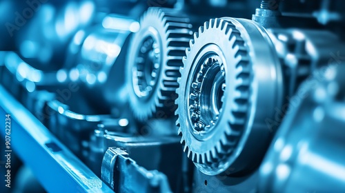 © Humeyra, Fototapeta premium Engine gear wheels create an industrial background representing the car service industry concept with a blue tone