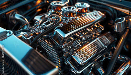 © Oleksiy, Fototapeta premium engine repair. cylinder head in the workshop, Car engine on grey background