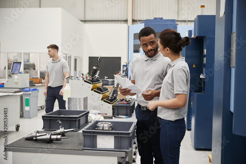 Obraz premium Engineer And Apprentice Meet On Floor Of Engineering Workshop