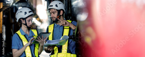 © kanpisut, Obraz premium Engineer checking construction process railway and checking work on railroad station . Railway engineer checking machines in train station. Train engineer concept