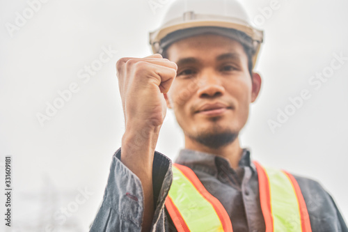 © Suriyo, Obraz premium Engineer hard hat safety suit success project