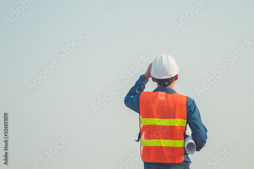 Obraz premium Engineer hold blue prints looking forward with hope and keep going at...