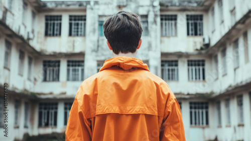 © Michael, Fototapeta premium Engineer in an orange jacket inspecting a decaying, abandoned building with broken windows, capturing the essence of urban exploration and decay