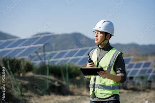 © zhu difeng, Fototapeta premium Engineer inspecting a photovoltaic power station on-site while holding a tablet and walkie-talkie