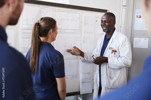 Fototapeta premium Engineer instructing apprentice at white board, close up