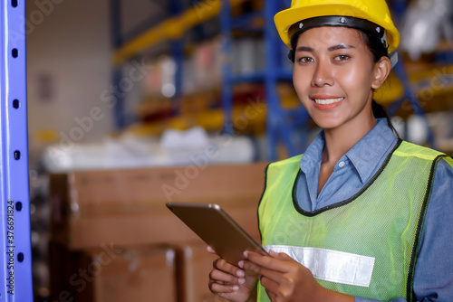 © totojang1977, Fototapeta premium Engineer warehouse woman wearing a hardhat standing cargo at goods warehouse and check for control loading from Cargo freight ship for import and export by report on tablet. Teamwork concept