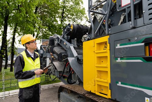 Fototapeta premium Engineer with digital tablet next to road construction machine.