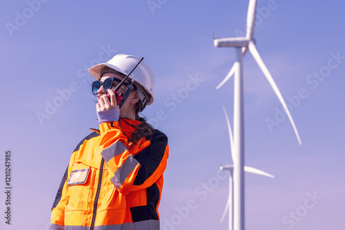 © unikyluckk, Obraz premium Engineer woman in hardhat with laptop and blueprint working on wind turbines at electricity power station background. Renewable energy, wind turbine generate electricity to produce energy .