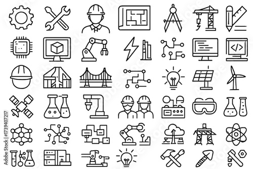 Naklejka premium Engineering and Technology Icon Set — Industrial, Mechanical, and Innovation Outline Symbols