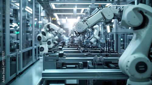Fototapeta premium Engineering concept of an automated factory line with robotic arms and...