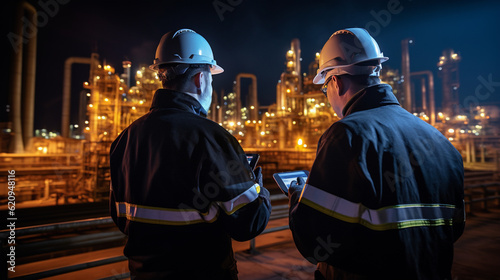 © LifeGen, Obraz premium engineering men standing in front of factory, generative ai