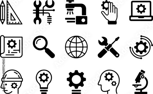 Fototapeta premium Engineering & Technology Tools Vector Graphic Bundle – Gear, Wrench, Tech Icons