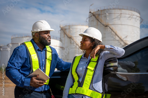 © APchanel, Obraz premium Engineers africa worker wearing examining survey checking blueprint standing in front of car Industrial chimneys facility gas or oil refinery engaged in a job requires high safety standards concept.