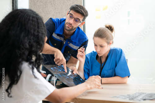 © Wosunan, Obraz premium Engineers, doctors and physical therapists brainstorm ideas to design a robot with arm and hand organs, To be utilized for additional testing on patients.
