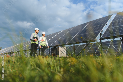 Obraz premium Engineers inspecting large solar power panels in field