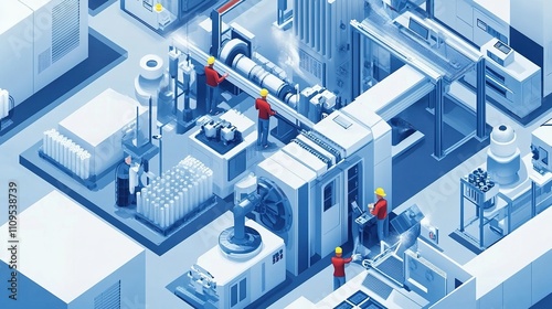 Fototapeta premium Engineers setting up complex machinery for a high-tech production facility.