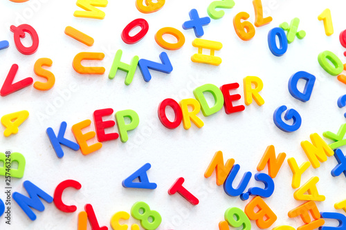 Fototapeta premium englischer Text Keep order, umgeben von vielen bunten Buchstaben