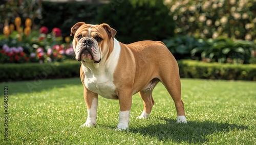 © PixelMinds, Fototapeta premium English Bulldog in Garden – Ultra Realistic Outdoor Portrait