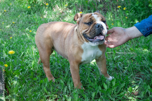 © tikhomirovsergey, Fototapeta premium English bulldog is standing on a green meadow with dandelion flowers.
