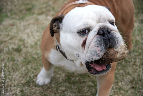 © Artem, Fototapeta premium English bulldog playing with wooden stick on nature background.