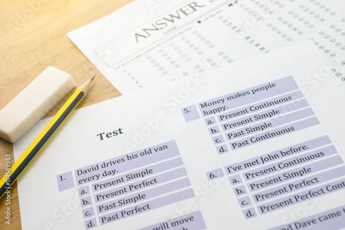 © lamaip, Obraz premium english exercise and answer sheet and pencil on table with gradi