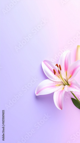 © Shokoriita, Fototapeta premium English: Pink lily flower on pastel gradient background, minimalist composition