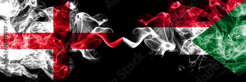 © Vlad, Fototapeta premium English vs Sudan, Sudanese smoky mystic flags placed side by side. Thick colored silky smokes flag of England and Sudan, Sudanese.