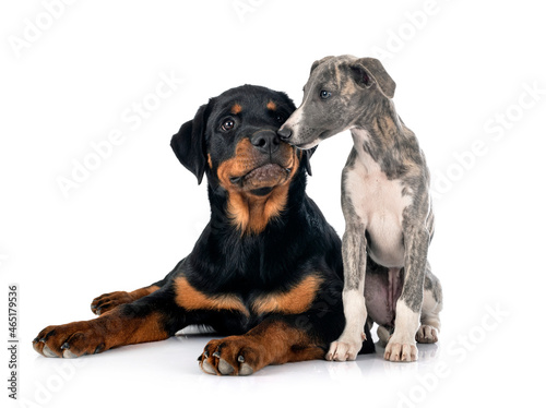 © cynoclub, Fototapeta premium English Whippet and rottweiler in studio