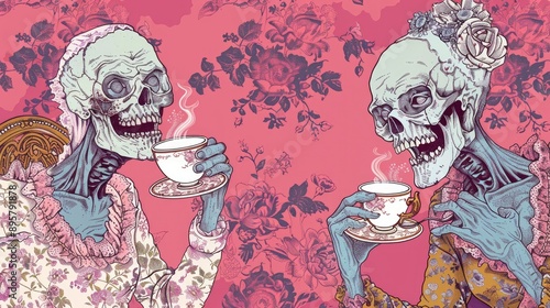 © pngking, Naklejka premium English zombies enjoying afternoon tea repeating pattern