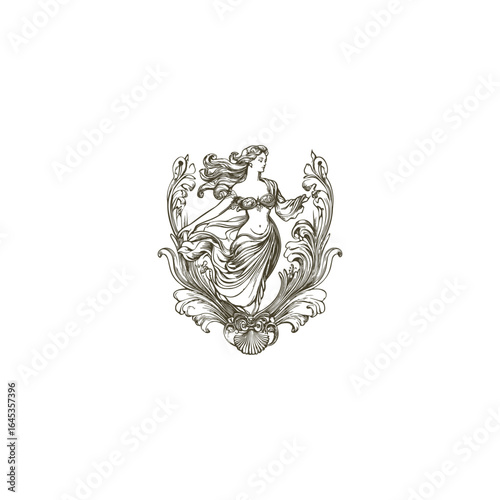 Obraz premium engraved illustration of a woman with long, flowing hair and ornate clothing,...