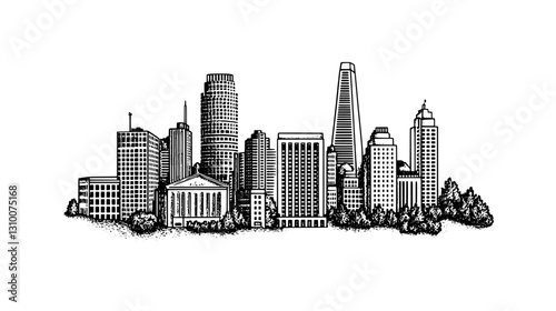 Fototapeta premium Engraved urban skyline with intricate details showcasing buildings, trees,...
