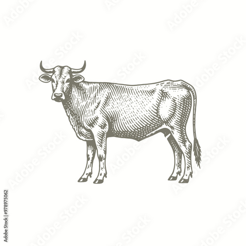 Fototapeta premium engraving of a cow is standing in a drawing on a white background
