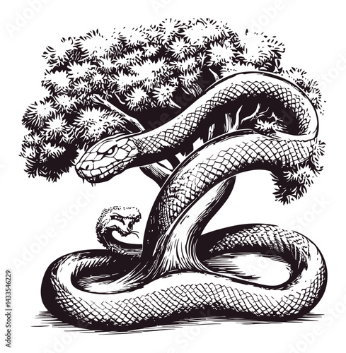 © indah, Fototapeta premium Engraving of Snake Wrapped Around Tree in Black and White Illustration