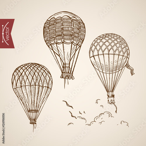 © Sentavio, Obraz premium Engraving vintage hand drawn vector flying balloon Pencil Sketch