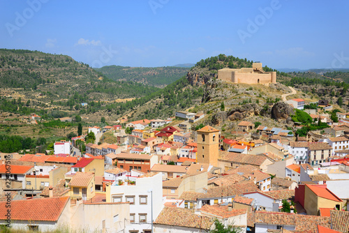 Fototapeta premium Enguidanos, Spain - September 2, 2018: Population of Enguidanos and its castle.