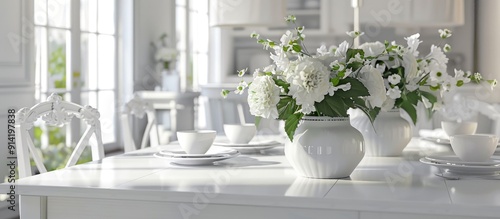 Fototapeta premium Enhance your dining area with an elegant white dining table set featuring a fresh inviting look that complements any decor in a copy space image