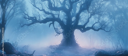 Naklejka premium Enigmatic ancient tree in a misty forest.