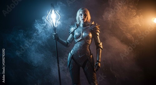 Naklejka premium Enigmatic armored woman standing amidst smoky illumination with mystic staff
