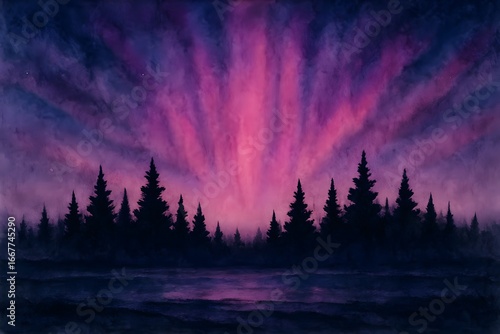 Naklejka premium Enigmatic Aurora Borealis Display Over Tranquil Forest Lake at Twilight...