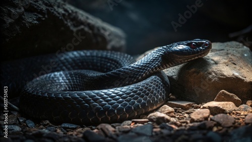 © Aslam, Fototapeta premium Enigmatic Black Snake Coiled Among Stones in Quiet Environment