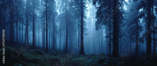 © abderahim, Obraz premium Enigmatic blue forest path shrouded in mist perfect for fantasy or mystery themes