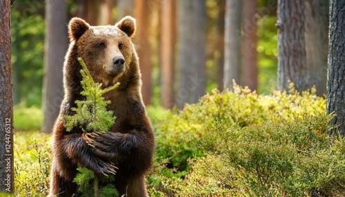 © netsay, Fototapeta premium Enigmatic Brown Bear Standing on its Hind Legs, Amidst the Lush Forest Backdrop, Showcasing a Rare Display of Curiosity and Strength in the Wild.