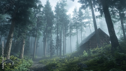 © adiba sakila atmari, Obraz premium Enigmatic Cabin in Misty Forest