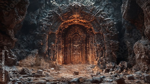 © Jakkarin, Fototapeta premium Enigmatic Dark Fantasy Dungeon with Intricate Stone Door and Mysterious Aura in 3D Visualization