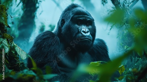 Naklejka premium Enigmatic Encounter: Majestic Mountain Gorilla Amid Misty Forest