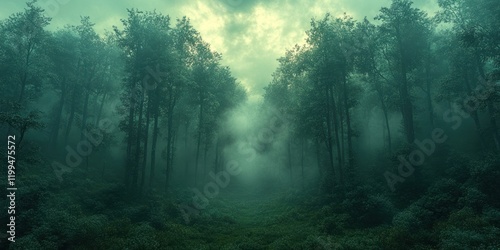 Fototapeta premium Enigmatic Foggy Forest Path: A Mystical Journey into the Green Depths