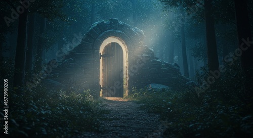 © Naru, Fototapeta premium Enigmatic Forest Gateway - A mystical stone archway with a glowing wooden door stands in a dark, foggy forest. A path leads towards it