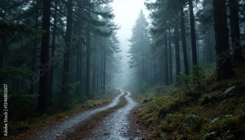Fototapeta premium Enigmatic Forest Path: A Misty, Mysterious Journey